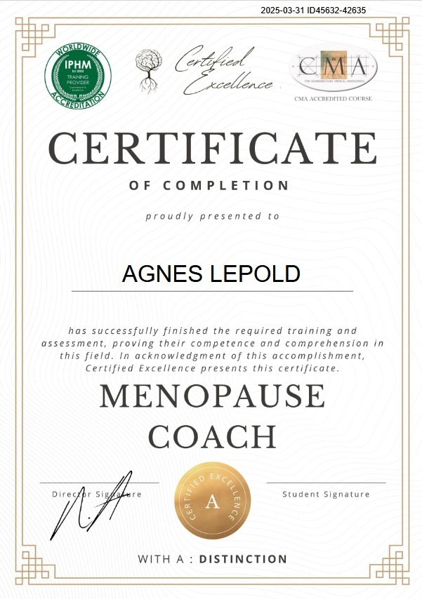 A „Certified Excellence” tanfolyama során áttekintettük a változókor fiziológiáját, egészségügyi kockázatait és kellemetlen tüneteit. Az okok megismerése mellett átfogó képet kaptunk a kezelés lehetőségeiről orvosi, természetgyógyászi, étkezési, testedzési és lelki szempontból is. Nagyon komplex módom, sok oldalról megközelítve a témát, tárgyaltuk a megoldási módokat. A coach szerepéről és a coaching módszertanáról is megtanultuk a legfontosabbakat, melyeket a gyakorlat érlel valódi tudássá. A tanfolyam során 18 modult kellett megtanulnom, mindegyik után tesztet írni. Végül a tanfolyam teljes anyagából islevizsgáztam, és az elvégzéséről tanúsítványt szereztem.